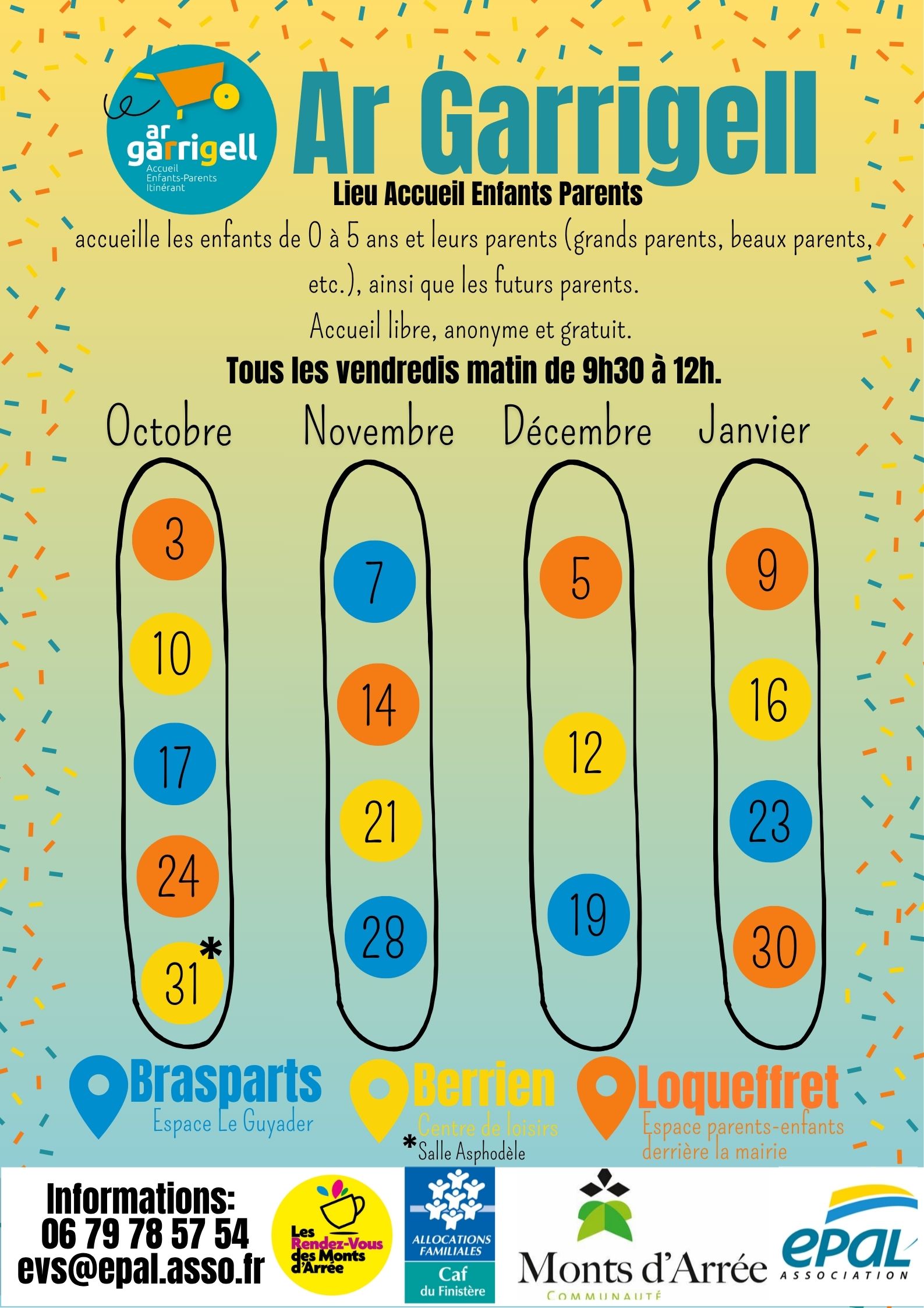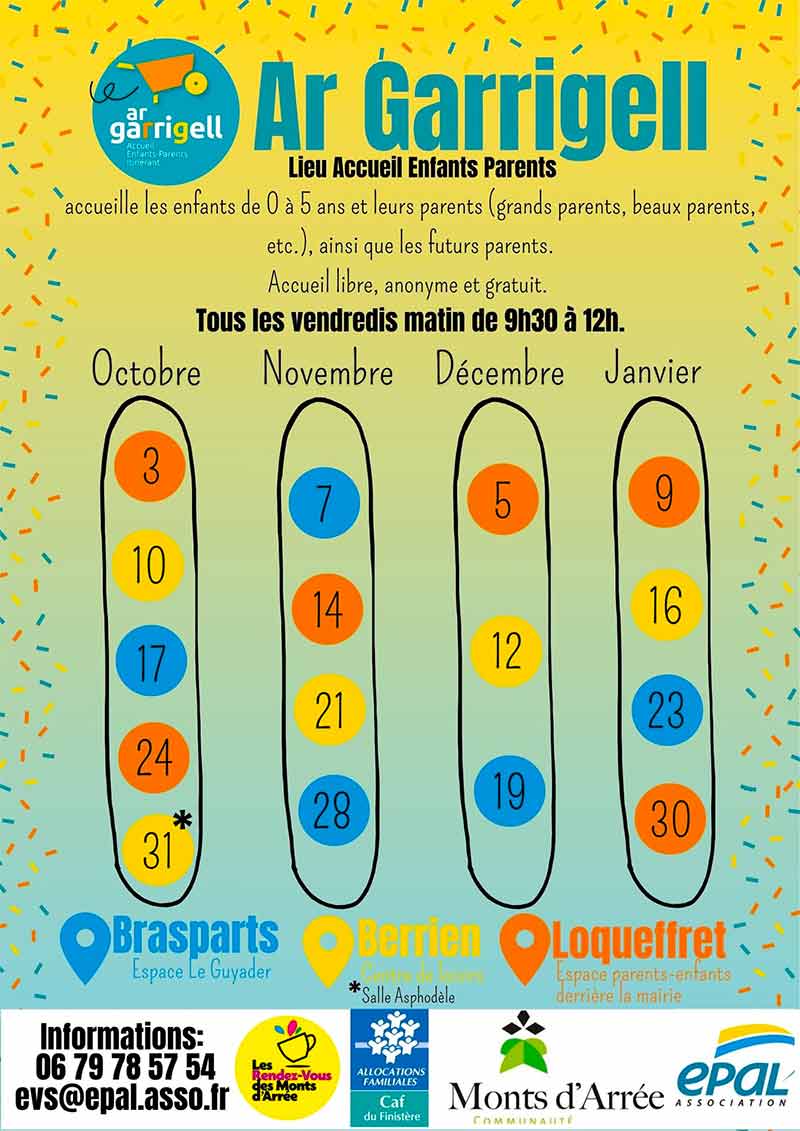 Ar Garrigell, accueille les enfants de 0 à 6 ans accompagnés d’un adulte (parent, grand-parent, beau-parent, etc.), et les futurs parents, chaque vendredi de 9h30 à 12h00, en alternance sur trois communes : Berrien, Brasparts et Loqueffret.