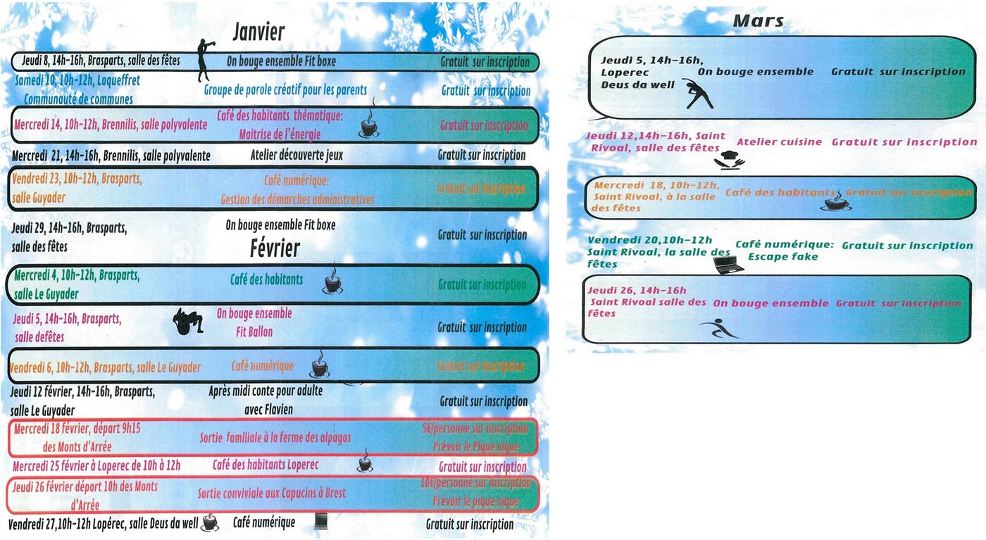 Le centre social itinérant « Les Rendez-vous des Monts d’Arrée », porté par l’association EPAL propose tout au long de l’année différentes actions et animations autour de la parentalité, la lutte contre l’isolement et le soutien aux associations. Il est ouvert à tous les habitants de Monts d’Arrée Communauté et de ses alentours.